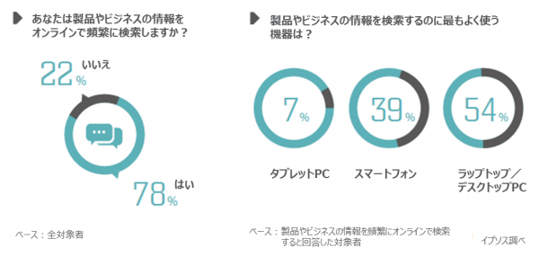 中国では、モバイルインターネットとスマートフォンの普及により、O2O市場のモバイル化が進んでいる。イプソスが実施した調査結果のよると、対象者の8割近く(78%)が製品やビジネスの情報をインターネットで検索すると回答した。インターネットで製品やビジネスの情報を頻繁に検索すると回答した人々のうち、46%がモバイル機器(スマートフォン 39%、タブレットPC 7%)を利用すると回答した。