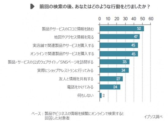 オンラインで情報を検索した後、中国の消費者はどのような行動をとるのか。調査によると、最も多く回答があったのは、「製品やサービスの口コミ情報を読む(52%)」であった。次いで「地図やアクセス情報を見る(47%)」、「実店舗で関連製品やサービスを購入する(45%)」「オンラインで関連製品やサービスを購入する(45%)」、「製品・サービスの公式ウェブサイト/SNSページを訪問する(35%)」と続く。ネット上での口コミ情報や噂が購入決定に大きな影響を及ぼしているようだ。オフラインビジネスでは、提供する製品やサービスの品質を高めると同時に、お客様とのつながりを強め、お客様に口コミを書き込んでもらえるよう心がけることが重要である。ウェブサイト上では、O2Oの効果を健全に高めるために、ユーザーからの評価やコメントを集める仕組みが必要だ。
