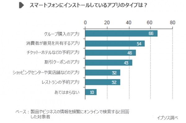 イプソスの統計によると、6割以上(66%)の対象者がグループ購入のアプリをインストールしている。グループ購入のアプリは最も人気のあるアプリだ。中国の消費者のグループ購入に対する熱は冷めていないが、利用する機器はPCからモバイルへ移行している。位置情報サービスと組み合わせることで、これらのビジネスの多くがより消費者との距離を縮めている。たとえば、あるレストランに近い場所にいるモバイルユーザーは、そのサービスを購入する可能性が高い。位置サービスを利用しターゲットを絞ることでグループ購入の成長に拍車をかけることになる。