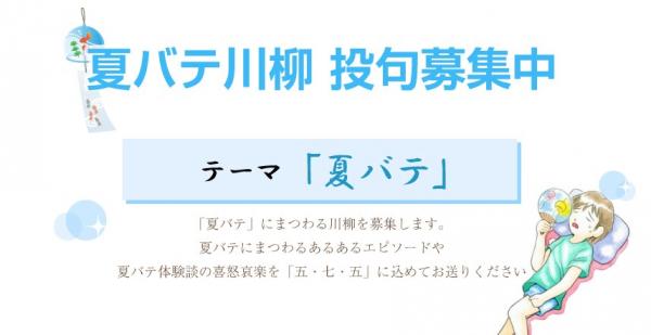 夏バテに関わる、「クーラー節約体験段」「女性の恥ずかしい体験」「大笑いしてしまった体験談」面白い・笑い・感動・哀愁など日常のエピソードを「5・7・5」の合計17文字以上のリズムにのせた川柳作品(字あまり、字足らずの作品も可)を募集。