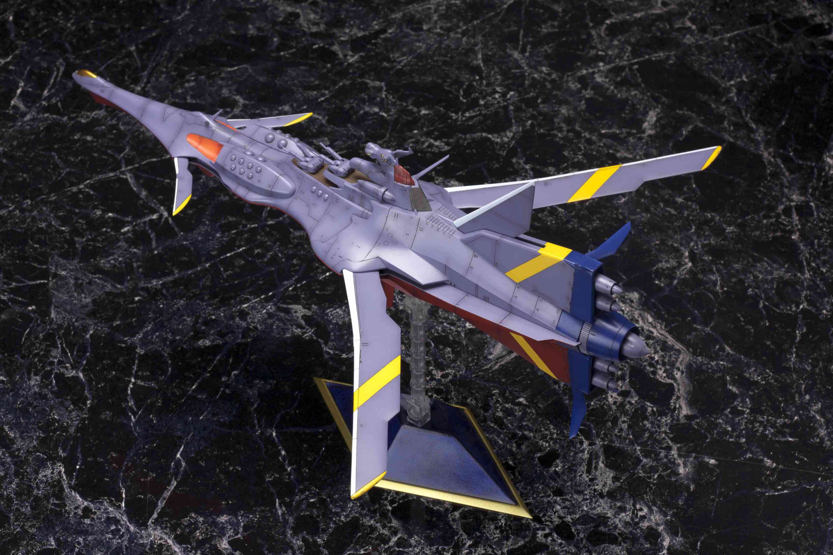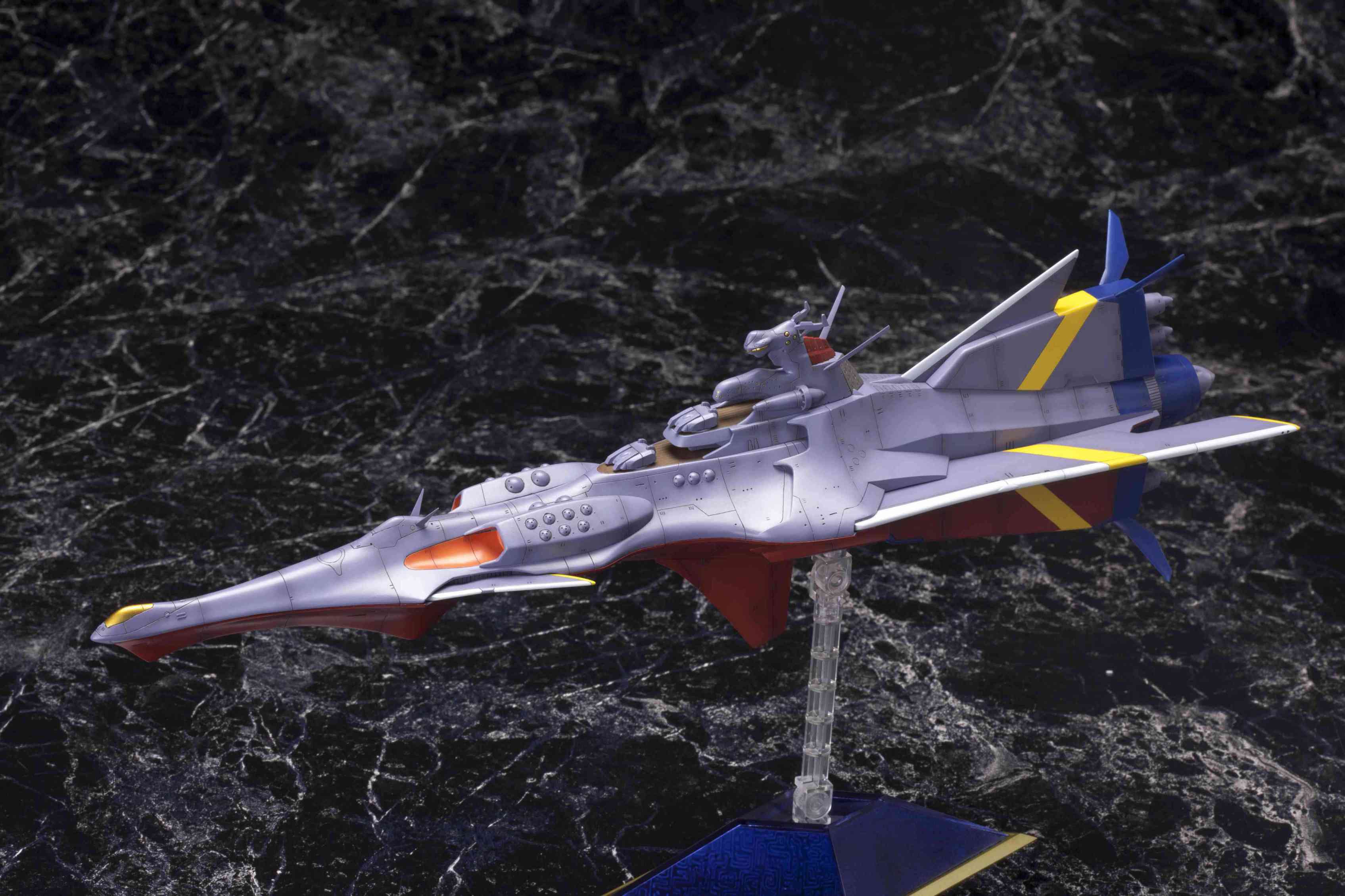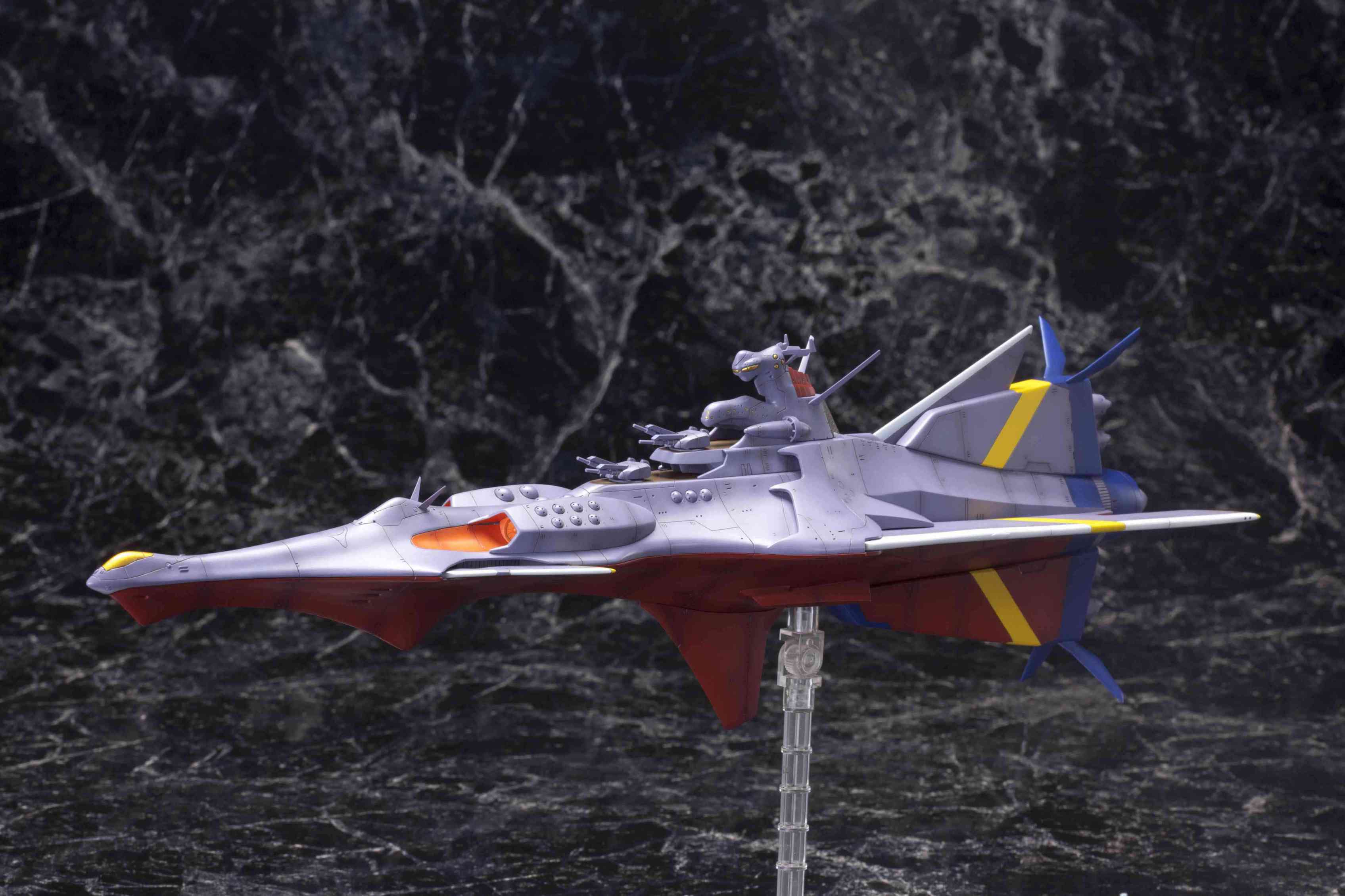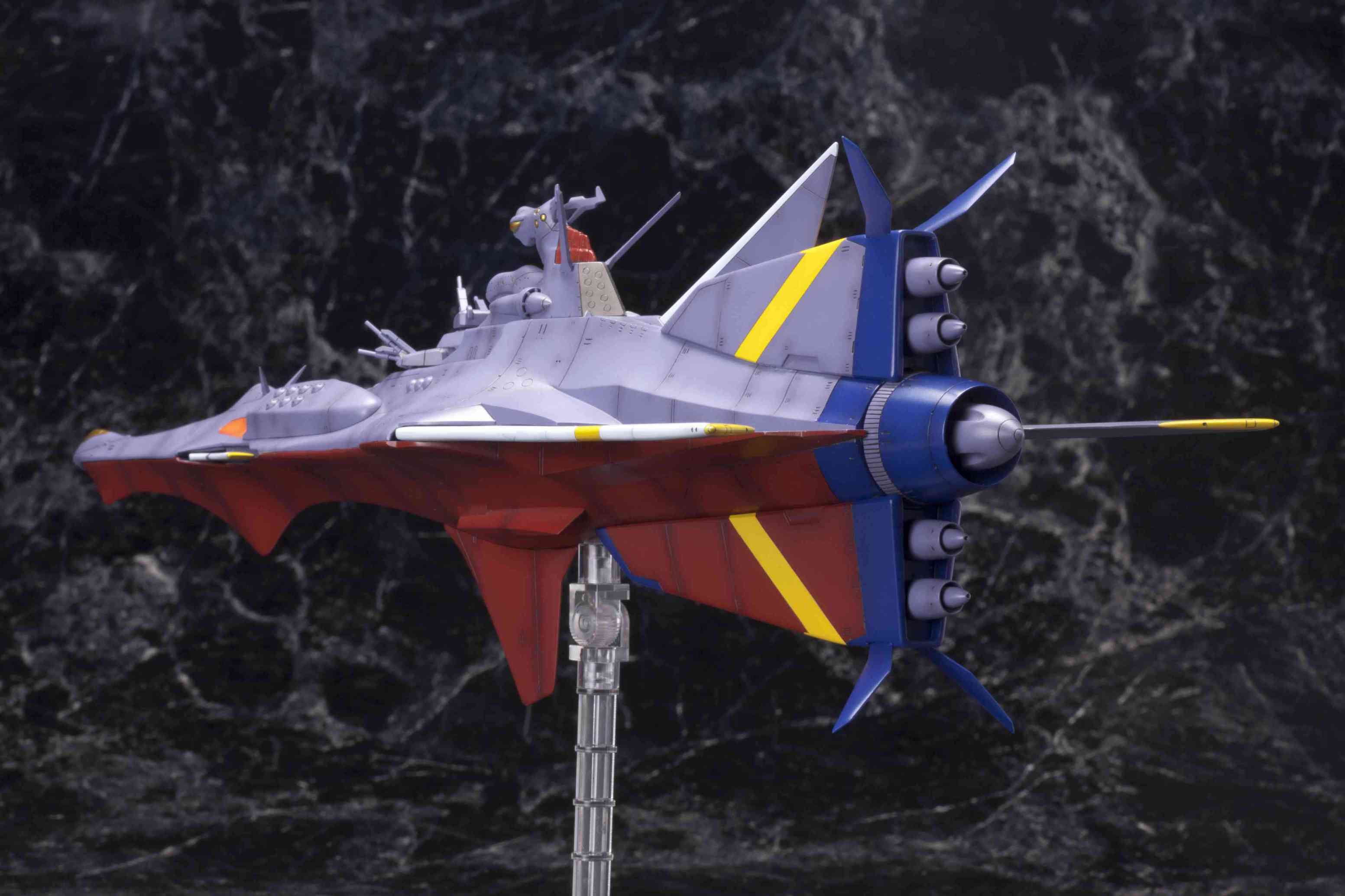 90年代に人気を博したテレビアニメ『ふしぎの海のナディア』の劇中に登場した幻の発掘戦艦「Ν-ノーチラス号」。作中で印象的なアイコンであるブルーウォーターを台座としてあしらい、主翼、副翼、垂直尾翼は、後部ブースターを回転させる事で連動して展開/収納する事ができます。ベースはクリアー成型となっており、内部に印刷済みの文様シートを入れてブルーウォーターを再現できます。収納状態の砲塔が2基付属し、ギミック後部ブースター部を回転させると連動して各翼が展開/収納します。また、主砲の砲身は可動式で、収納状態の砲塔を差替えて再現できます。艦橋窓部と専用ベースの金色部分は塗装済みとなっています。全長約30cmの迫力の戦艦を是非お手元でお楽しみください。