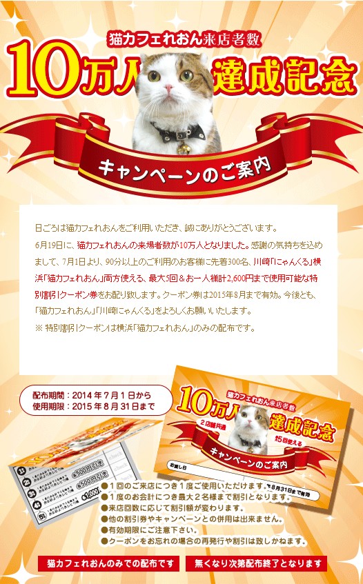 現在「猫カフェれおん」では10万人達成記念キャンペーンと致しまして、7月1日より、90分以上ご利用のお客様先着300名様に、最大5回&お一人様最大計2,600円使用可能な特別割引クーポンをお配りしております。