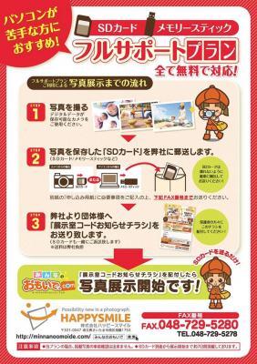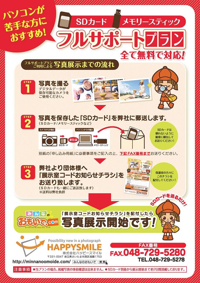 今回の新機能「フルサポートプラン」では、写真代行販売サイト「みんなのおもいで.com」を導入頂く際、パソコン操作が苦手な団体様や、インターネット環境の無い団体様でもご利用頂けるよう、デジタルカメラからSDカードを抜いて当社にお送り頂くだけでみんなのおもいで.com上で、展示販売をすることが可能となった新プランです。利用料金は全て無料です。