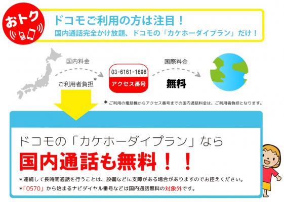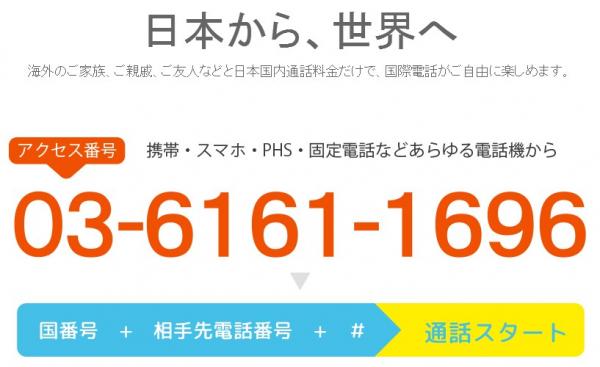 国際電話部分の料金は無料になり、通常の日本国内通話料金だけで、海外にいるビジネスパトーナ、家族、またはお友達との国際電話がご自由に楽しめるサービスです。
