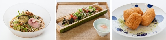 【写真】 左:葱ごま油そば 中:ごま蕎麦(ごま油風味) 右:神楽揚げ(ごま油使用)