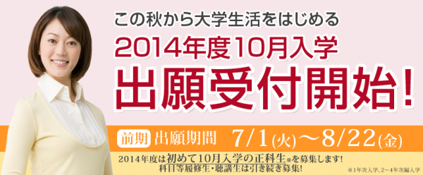 現在大手前大学通信教育課程は2014年度10月入学前期日程の出願受付中です。出願受付期間は2014年7月1日(火)から8月22日(金)(必着)です。