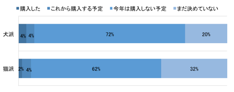 女性の場合、犬派は購入しない予定が78%に対し、猫派は66%です。男性は犬派が72%に対し、猫派は62%と、男女ともに10%以上の差があります。