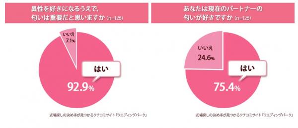 『異性を好きになるうえで、匂いは重要だと思いますか(単一選択)』という質問に9割以上の女性が「はい」と回答、また『あなたは現在のパートナーの匂いが好きですか(単一選択)』という質問には7割以上の女性が「はい」と答えており、女性が彼氏や結婚相手を探すうえで、匂いが重要なポイントである事がわかりました。