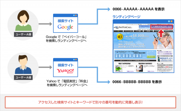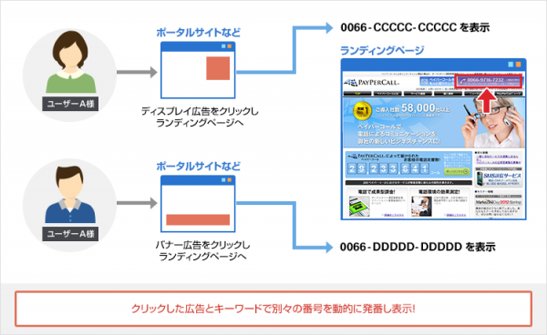 コムスクエアが特許を取得している「動的に電話番号を発番する方式」により、ネット広告毎に異なる電話番号を表示し、広告からの電話問い合わせ件数、検索キーワード、検索エンジン、流入経路を判定することができます。