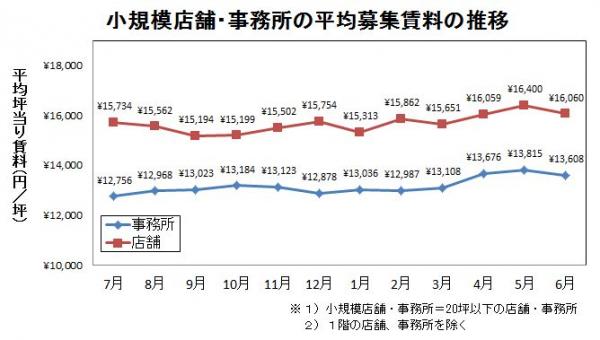 小規模店舗(20坪以下)の平均募集賃料は、6月に前月から2.1%下降し、4月とほぼ同水準の1.6万円に落ち着きました。