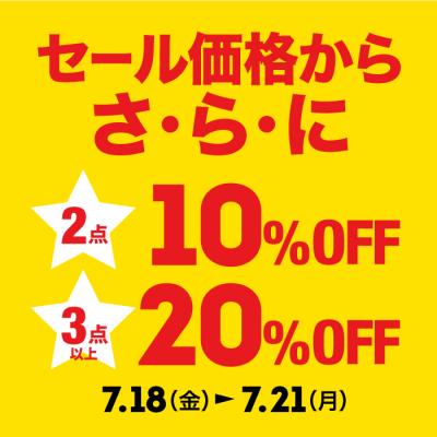 SALE品2点で10%OFF、3点以上で20%OFFとなります。