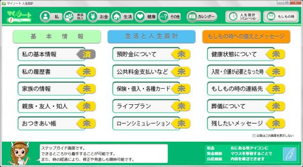 4.パソコンの操作に不慣れでも、簡単に使える操作画面です。“まだパソコン初心者だから、難しいことはできない”、『マイノート 人生設計』なら、そんなことを感じることもありません。大きな文字、大きなボタンでデザインされているだけでなく、銀行の ATM 操作のようにマニュアルを見ることなく直感的に操作できるように画面を設計しています。また、ナビゲート・キャラクターが使い方を教えてくれるので、パソコンに不慣れな方でも安心してご利用いただけます。