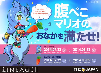 PC向けオンラインゲーム『リネージュ2~Epic Tale of Aden~(以下、『リネージュ2』)』をサービス、運営しているエヌ・シー・ジャパン株式会社(東京都渋谷区、代表取締役:金 澤憲(キム テクホン))は、2014年7月22日(火)定期メンテナンス終了後から2014年8月12日(火)定期メンテナンス開始前まで「腹ぺこマリオのおなかを満たせ!」を実施いたします。
