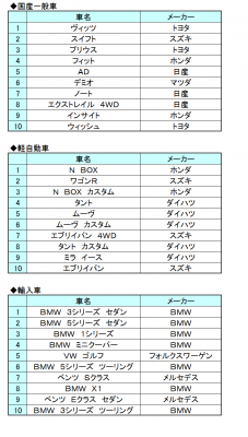 国産一般車部門は、4カ月連続ランクインのヴィッツ(トヨタ)が遂に首位に躍り出ました。更に、プリウス(トヨタ)が20カ月連続でトップ10入りし、不動の人気を誇っております。軽自動車部門は、3カ月ぶりにN BOX(ホンダ)が首位に返り咲き。今年に入り、N BOX(ホンダ)、ワゴンR(スズキ)、ムーヴ(ダイハツ)ら人気車種のトップ争いが続いております。輸入車部門は、BMW ミニクーパーが3カ月ぶりにランクイン。BMW車が半数以上を占める中、VW ゴルフが6カ月連続ランクインし、安定した人気を見せております。次回は逆転となるでしょうか。今後も注目の車種です。