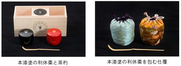 100周年のマセラティロゴをあしらった桐箱に収められた、黒と朱、対の本漆塗の利休棗(なつめ/茶器)上部には、トライデントの意匠が施されています。黒の棗を包む仕覆(しふく)の裂地柄(きれじがら)には、マセラティロゴの由来となったボローニャ市の紋章海神・ネプチューンから、波を示す日本古来の吉祥文様「青海波と兎」を、また朱の棗にはイタリアの国花デイジーから、華やぎのある金地の「菊花垣根」を採用しました。