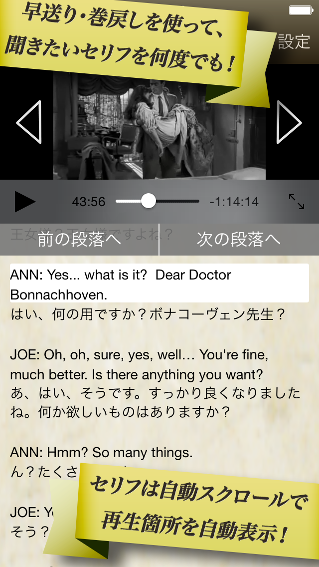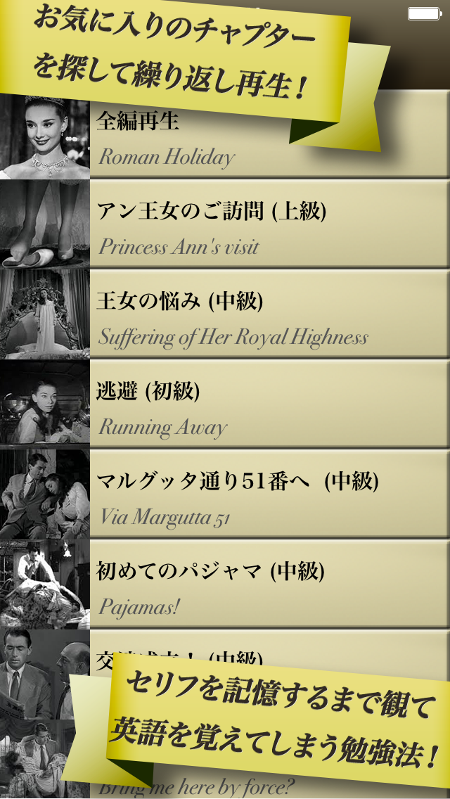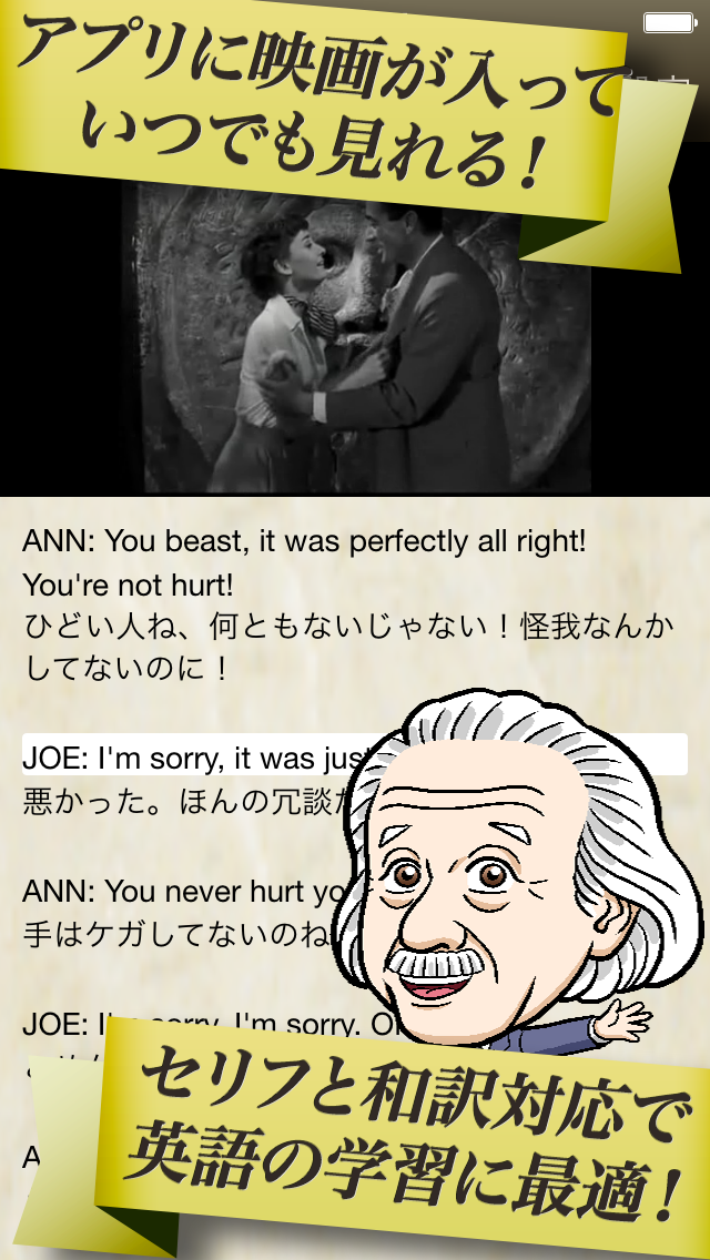 名作『ローマの休日』の動画を全て収録(1時間58分)、映画の中のセリフは全て英文・和訳で表示されていて、難しい単語には注釈が用意されている等、アプリならではの機能を活かして英語力を上達できます。