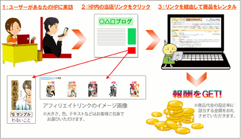 Renta!アフィリエイトとは、バリューコマース株式会社が提供するバリューコマースアフィリエイトプログラムを通じ、「電子貸本Renta!」で販売している電子書籍作品を、ユーザーが自身のホームページやブログなどで紹介して、その紹介を通して作品が購入された場合に、成果報酬を受けとることができるサービスです。