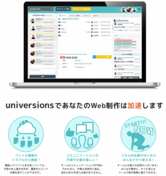 「universions」は様々なスキルの協業があるWebクリエイターの現場に注目し、チーム全員で使えるファイルの履歴管理、そしてコラボレーションツール(Wiki, タスク, チャットなど)を実現しています。