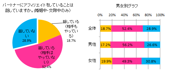 お互いがアフィリエイターであると認識しているカップル・夫婦は2割弱。相手に話さずにアフィリエイト活動をしている人が3割弱いることを考慮すると、実際のアフィリエイターカップル率はもう少し高い可能性も考えられますが、アフィリエイターでないパートナーを持つ人が全体の半数以上を占める結果となり、アフィリエイターの出会いの場・交友関係は特にアフィリエイト関連のつながりに限定されないことも見えてきました。男女別では、男性の方がパートナーにオープンにしている人が多いようです。