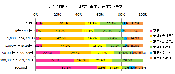 逆に、月平均30万円以上稼いでいる人のうち半数近くは副業の範囲でそれだけの収入を得ていることも、アフィリエイトの可能性として見逃せない結果となりました。