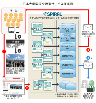 日本大学では、1906年(明治39年)に最初の留学生をドイツに派遣して以来、交換留学・派遣留学や短期海外研修等の国際交流を積極的に実施しています。学務部教育推進課国際交流室は、学術交流協定等を結んでいる29か国1地域111大学(2014年5月現在)にのぼる海外の大学間での、学生や教員の国際交流プログラムを主な業務としており、サマースクールやスプリングスクール、また、TOEFLの模擬試験やスコアアップ講座など、短期間に多数の申込みがあるために事務処理が煩雑になり、大きな負担になっていました。そこで、パイプドビッツの「スパイラル(R)」を導入し、効率化を実現しています。