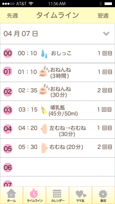 ・すべての記録(授乳、おむつ、おねんね)を時系列でタイムラインに一覧表示