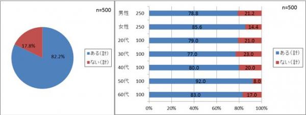性別や年代別で回答値に大きな差は見られないが、気になることが「ある」という回答については、50代(92.0%)と60代(83.0%)が、それぞれ全体のパーセンテージ(82.2%)を上回った。