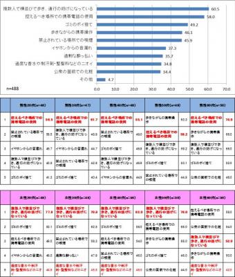 Q:あなたが、公共の場や電車の中などで気になる他人のマナーや振る舞いはどんなことですか。(いくつでも)