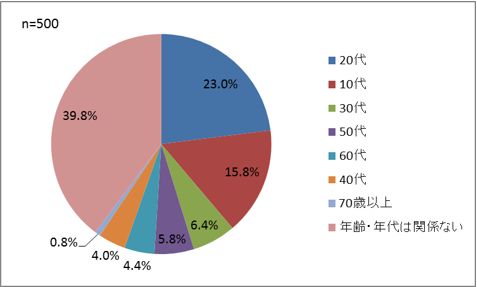 特定の年代を回答に挙げた人については、「20代」(23.0%)がトップ、次いで「10代」(15.8%)と、若年層に回答が集まる傾向が見られた。