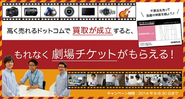 株式会社マーケットエンタープライズは、インターネットを利用した総合買取サービス「高く売れるドットコム」を展開し、全国50万人以上が利用するネット型リユース事業を展開しております。この度、ユナイテッド・シネマ株式会社との共同キャンペーンでは、買取サービスが成立したお客様全員に全国のユナイテッド・シネマ、シネプレックスで利用できる映画の劇場チケットのプレゼントキャンペーンを開始致します。
