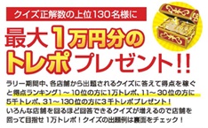 さらにキャンペーン期間中、各店舗から出題されるクイズに答え得点を稼ぐことで、得点ランキング上位10名の方に「1万トレポ」、11~30位の方に「5,000トレポ」、さらに31位~130位の方に「3,000」ポイントをプレゼント。 店舗毎に出題内容も変わるため、色々な店舗を回れば回るほど得点を稼ぐチャンスがあります。