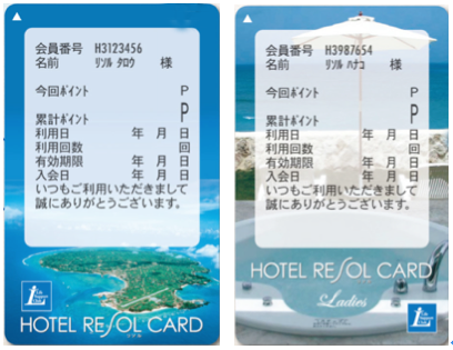 (写真▼)ホテルリソルカード男性用と女性用。下は生命の森リゾートでプレゼントされる共通商品券