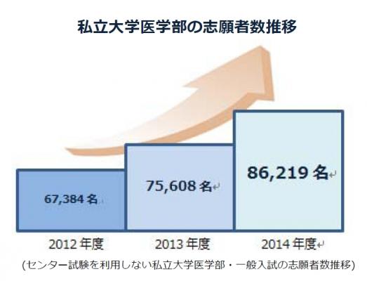 定員増や学費値下げ、また景気動向による安定志向等から、このところ医学部の人気は上昇傾向にあります。例えば、センター試験を利用しない私立大学医学部の一般入試志願者の合計は2012年度に67,384名であったものが、2014年度入試では86,219名と大幅に増加し、受験そのものがかなり厳しいものとなっているのが実状です。医学部に合格するには、圧倒的な学力と各大学の入試傾向に合わせた十分な対策が必要不可欠となっています。