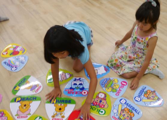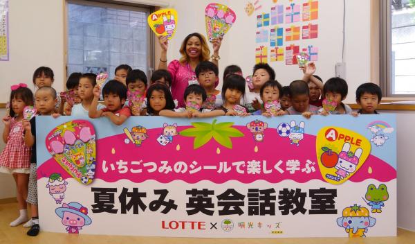 イベントは明光キッズのネイティブ講師により全て英語で実施され、ロッテの棒付きチョコレート「いちごつみ」のおまけの英単語シールを使ったゲームを中心に行ないました。ゲームでは、友だちと協力しながら英単語を完成させ、完成した時にはチーム全員が大声で「We did it !」とコールするなど大変盛り上がりました。本イベントを通して、子どもたちが夢中になりながら、楽しく積極的に英語に親しむことができました。