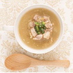 じっくり煮込んだたまねぎと鶏肉に、たっぷりのコラーゲンを加えた中華風スープです。腹持ちもよく、軽食としてもお召し上がりいただけます。素材を生かしたとろみ食感をお楽しみください。