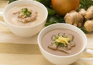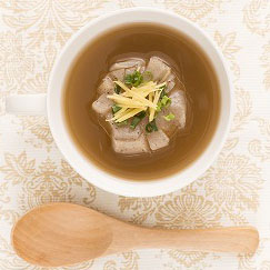 チキンコンソメをベースにたっぷりの生姜を加えた風味溢れるスープです。1食わずか26kcalと低カロリーなので副食の1品としてもお召し上がりいただけます。