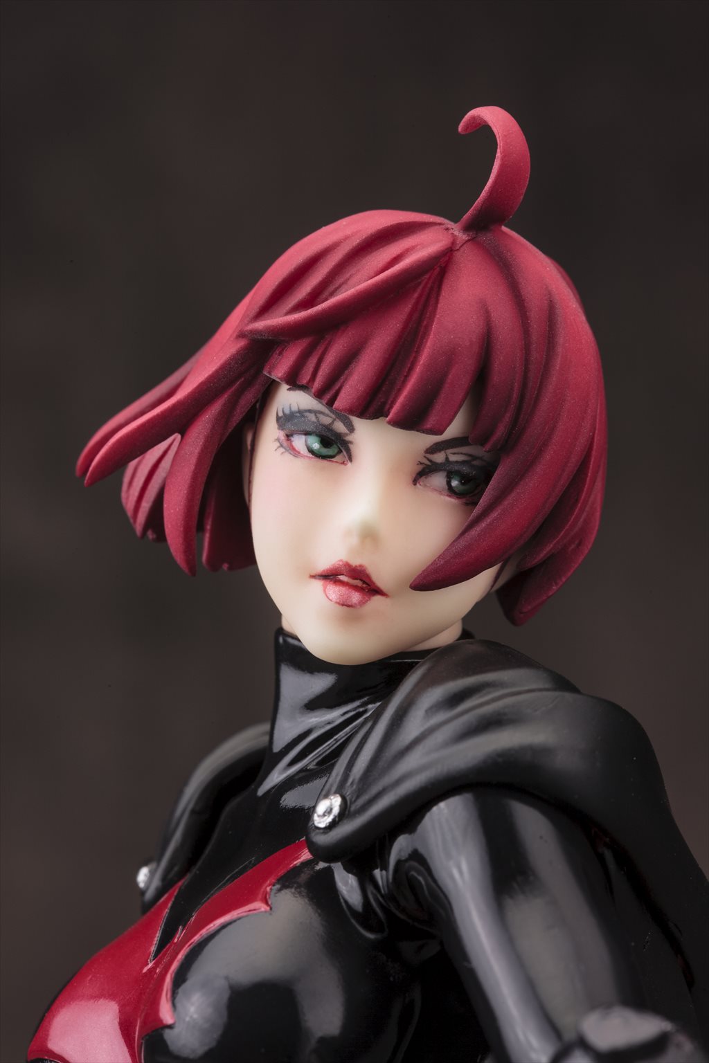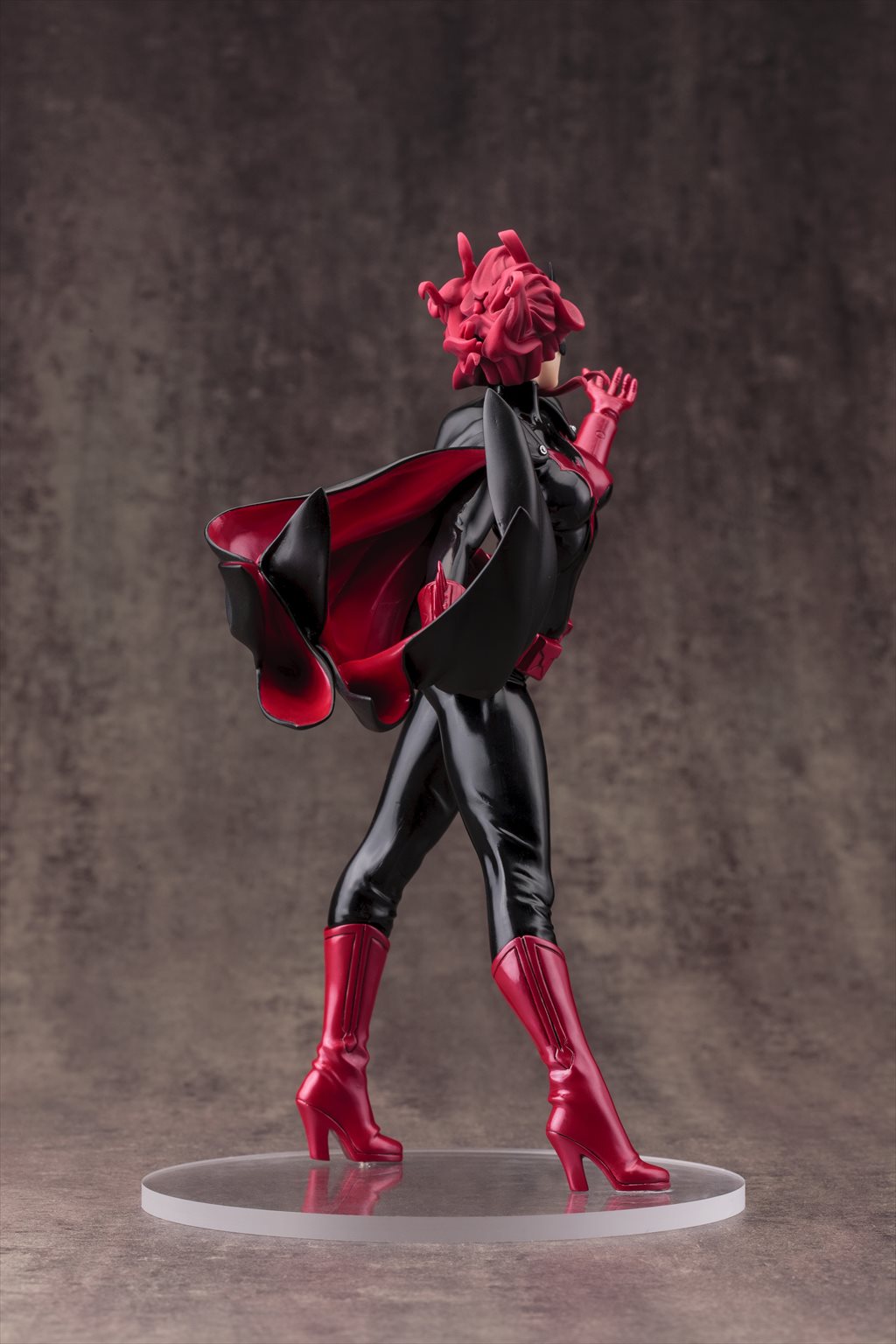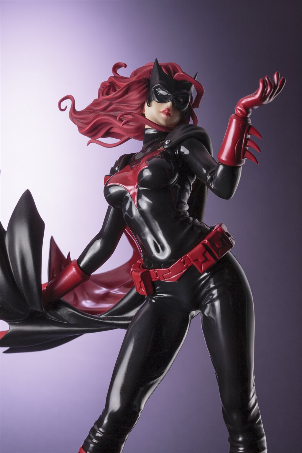 精悍なバットマスクの下から覗く唇は魅惑的に、マントとともに靡く特徴的なロングヘアーの色とも呼応した赤と黒のコントラスト鮮やかなコスチュームは、各所に生まれた皺表現でリアルなラバーの質感を表現しました。