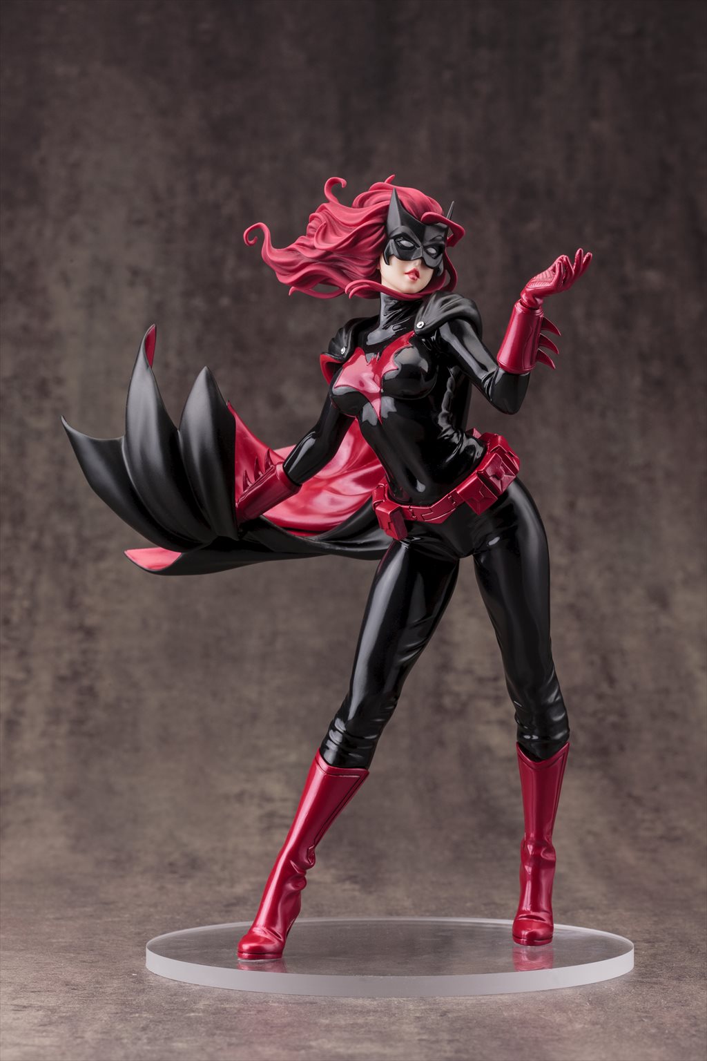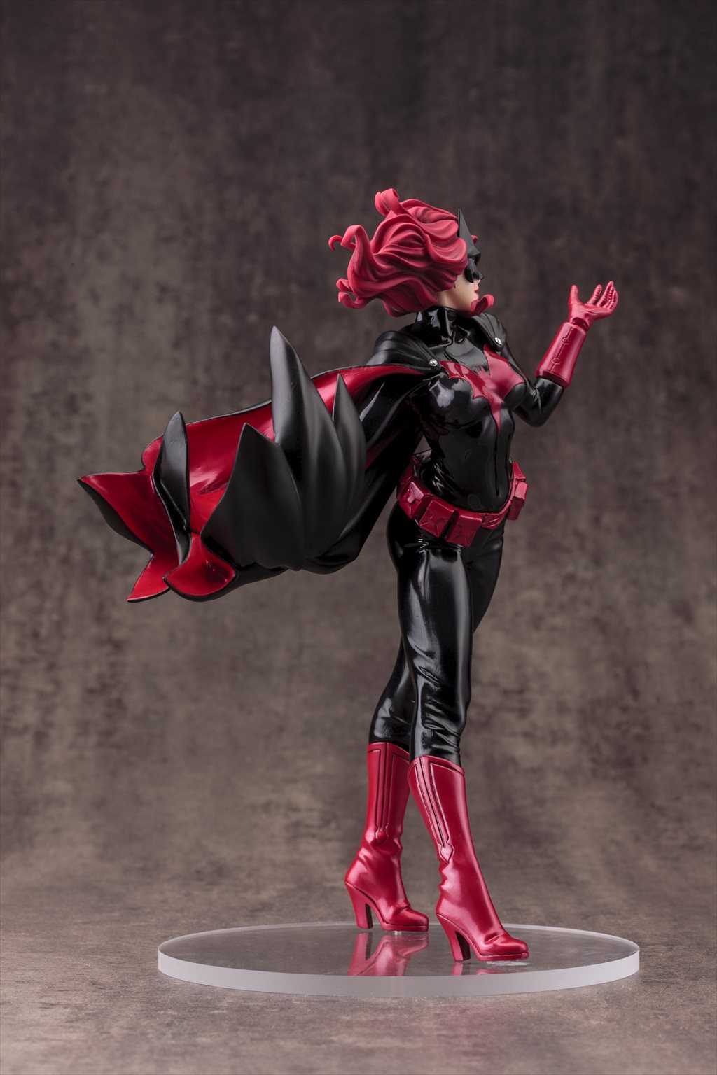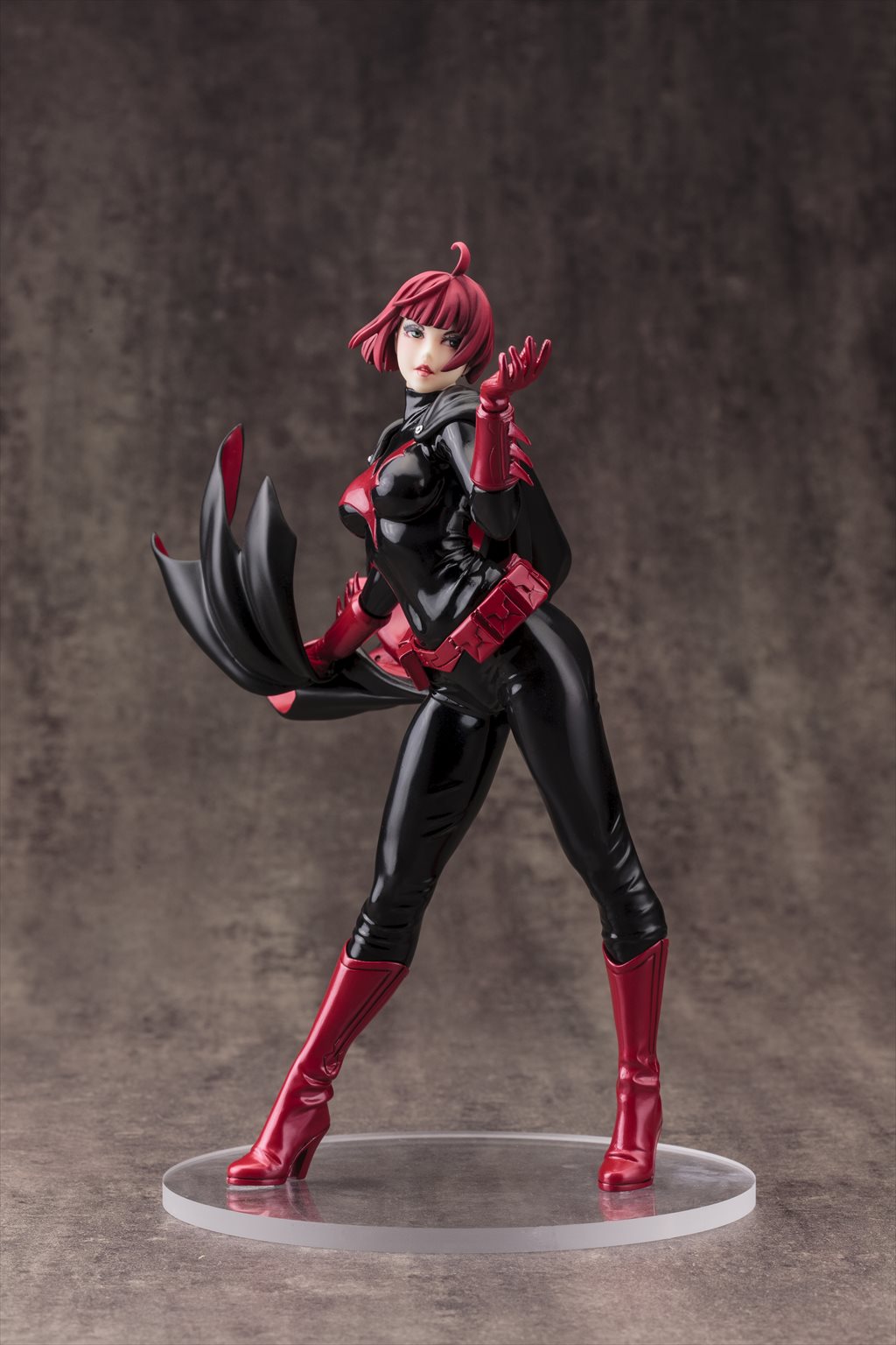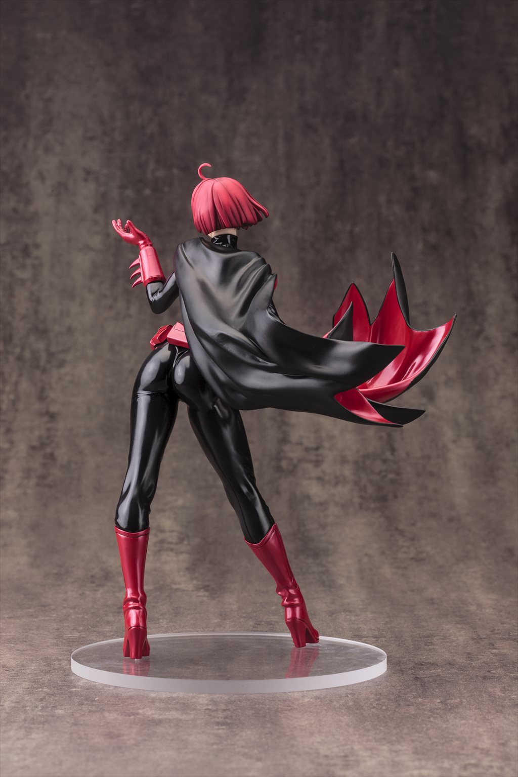 精悍なバットマスクの下から覗く唇は魅惑的に、マントとともに靡く特徴的なロングヘアーの色とも呼応した赤と黒のコントラスト鮮やかなコスチュームは、各所に生まれた皺表現でリアルなラバーの質感を表現しました。