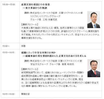 原因は、製造拠点の海外移転に伴う国内設備の老朽化を発端とし、ここに団塊世代のベテラン技術者の大量退職と若手世代への技術の継承不足と、生産設備のオートメーション化などが複合的に絡まった結果、現場力の喪失により、重大事故を招いているとされています。上記のうち、技術の継承不足などは産業特性を問わず、日本企業全般に通じる普遍的な落とし穴と見られています。本セミナーでは、産業災害の教訓から得られる企業のリスクマネジメントに精通する2人の専門家を講師にお招きし、産業災害の教訓とそれに伴う組織の安全対策と企業文化のあり方についてお話させていただきます。