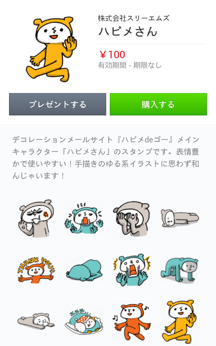 「ハピメさん」は弊社が運営するau向け公式サイト「ハピメdeゴー!」(http://hpm.bz)のオリジナルキャラクターです。癒し系のユルいハピメさんがアナタのLINEトークに癒しの空間をもたらします。