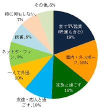 休日の過ごし方を尋ねると、『家でTV鑑賞(映画も含む)』が一番多く19%。次いで『屋内・外スポーツ』16%、『家族と過ごす』15%で半数を占めました。残りの半数は『友達・恋人と過ごす』、『一人で外出や『特に何もしない』など、回答が様々でした。(回答者数:134名 単一回答)