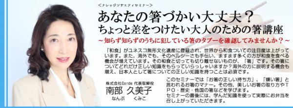 このセミナーでは「お箸の正しい持ち方」、「嫌い箸」と言われるお箸のマナー。その他、美しいお箸の取り方やTPO・歴史・他国の箸などを学びます。