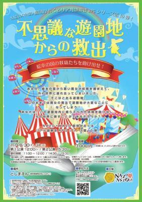 「日常を冒険に変える」をテーマに大人も楽しめるリアル謎解きRPGのイベントを提供するNAZO×NAZO劇団(合同会社ハレガケ)では、2014年8月30(土) & 8/31(日)と、練馬区の遊園地「としまえん」を舞台に、リアル謎解きRPGイベント「不思議な遊園地からの救出」を開催する。(http://nazoxnazo.com/2014/08/04/fushiginoyuenchi/)