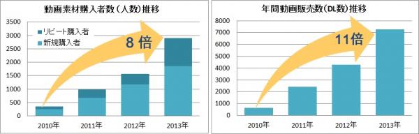 ピクスタでは2010年の動画素材の販売開始から約4年間で購入人数は8倍に、ダウンロード数は11倍に伸び、動画素材の累計売上高は1億円を突破しました。