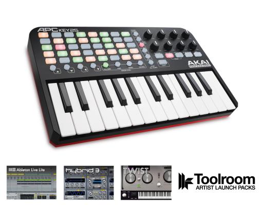 APC KEY 25は、5×8のAPCパッドと25鍵盤のミニ・キーボードが合体したコントローラです。USBバスパワー駆動によりアダプタが不要です。Mac/PCとシームレスに接続し、キーボードの機能として専用のオクターブボタンやサステインボタンを装備。ソフトは、Ableton Live Lite、AIR Music Tech Hybrid 3、SONiVOX Twist、Toolroom Records artist launch packs(ダウンロード提供)が付属します。