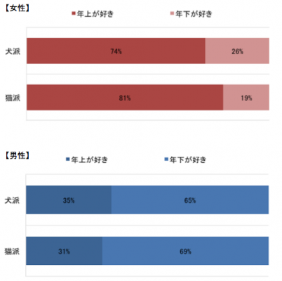 一方、男性の場合は、犬派の年上が好きは35%、年下好きは65%。猫派の年上が好きは31%、年氏が好きは69%となり、女性の数値とは真逆のものとなりました。
