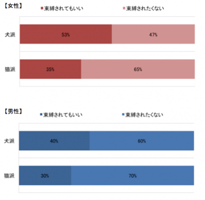 女性の場合、犬派の束縛されたくないと回答している人は47%、猫派の束縛されたくないと回答している人は65%となり、約20%猫派のほうが多いようです。