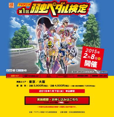 日本出版販売株式会社(本社:東京都千代田区 代表取締役社長:平林 彰 略称:日販)は、10月からテレビ東京系列各局にて第2期の放送が開始されるアニメ「弱虫ペダル」を題材とした「TVアニメ弱虫ペダル検定」を、2月8日(日)に東京・大阪で開催いたします。