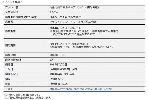 日本クラウド証券株式会社(本社:東京都港区、代表取締役社長:大前和徳、以下「日本クラウド証券」、HP:http://www.crowd-sec.com/)は、自社が運営する融資型クラウドファンディングサービス「クラウドバンク」にて、2014年8月15日より「再生可能エネルギーファンド(太陽光発電)」(https://crowdbank.jp/products/A00000065.html)の募集を開始することを発表しました。