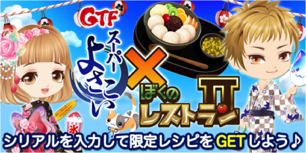 3)「ぼくのレストラン3」、「ぼくのレストランII」内「スーパーよさこい」のキャンペーンページに従ってシリアルナンバーを入力するとイベント来場者限定アイテムを取得できます。
